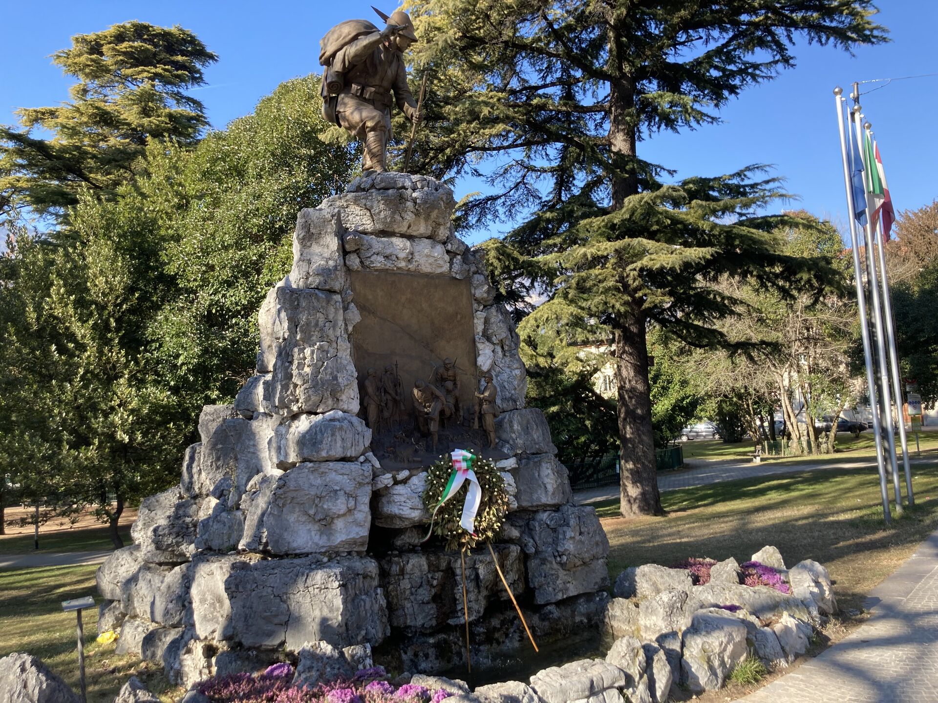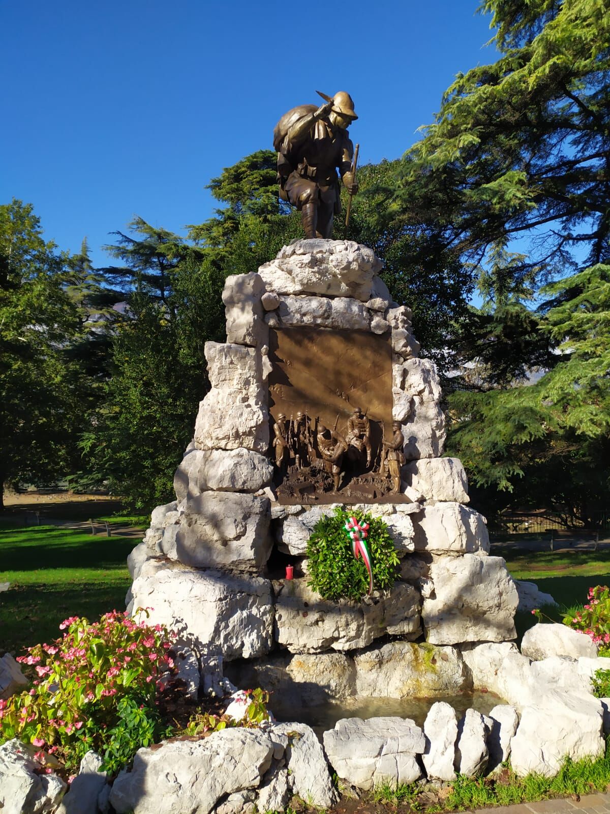 Opera dello scultore Carlo Fait, fu inaugurato nel 1940 su iniziativa di Don Antonio Rossaro. Il grande basamento è realizzato con grossi massi provenienti dai Lavini di Marco. La statua dell'Alpino è realizzata in bronzo, come pure gli altorilievi con scene di guerra del basamento.