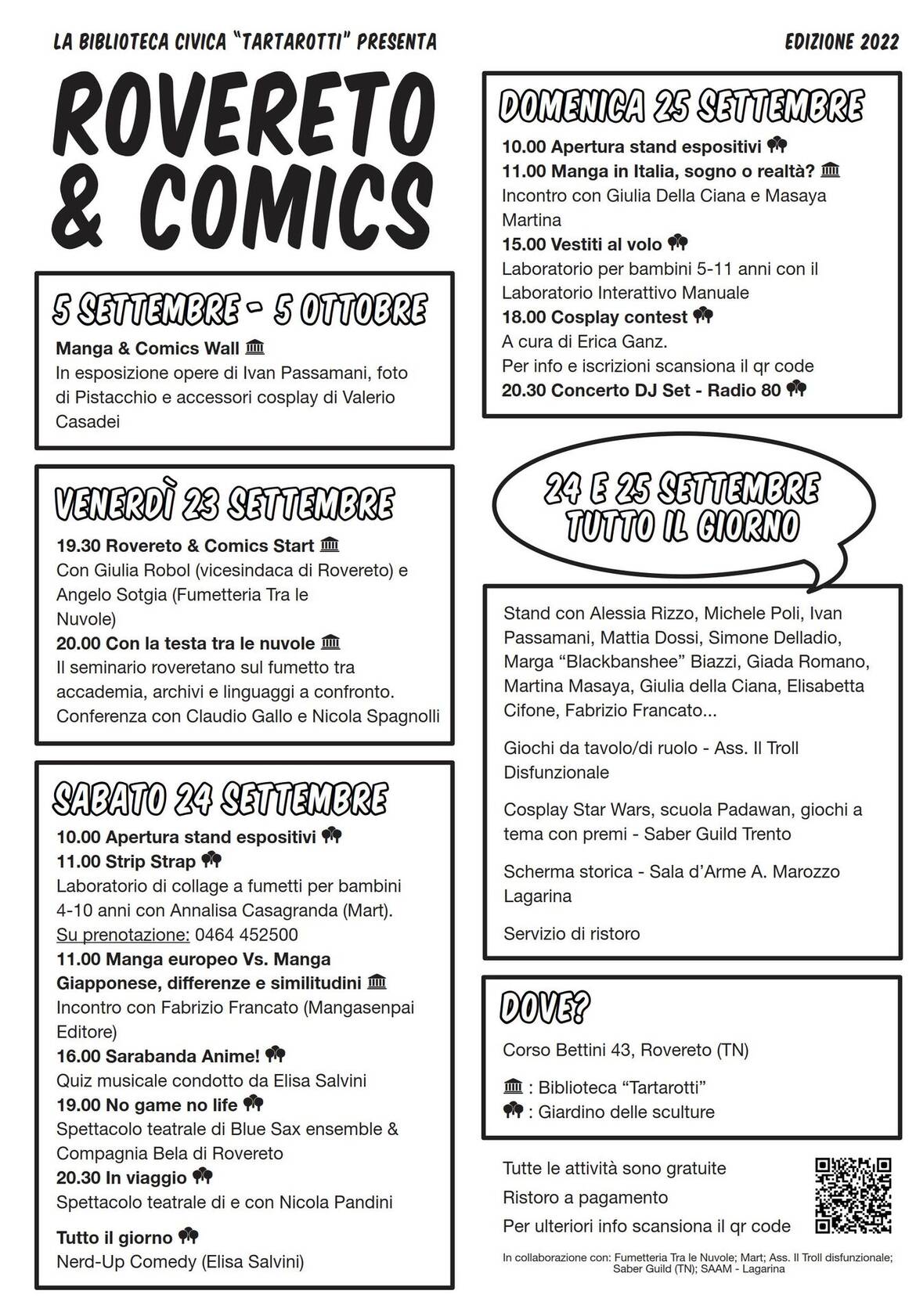 Il Festiva Rovereto & Comics è distribuito su tre giornate il 23, 24 e 25 settembre 2022, e si svolgerà presso il Giardino delle sculture del Mart e gli spazi della Biblioteca. Il programma è molto articolato: parteciperanno autori, editori di fumetti nonché esperti del settore e cosplayer. Sono previsti spettacoli teatrali e musica. Non mancheranno momenti dedicati alla condivisione della passione per i manga: Cosplay Contest (domenica 25), gare di riconoscimento di sigle di cartoni animati, laboratori per bambini…