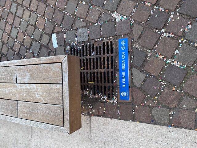 La scritta "il fiume inizia qui" sta proprio ad informare che tutto ciò che gettiamo nei tombini va a finire nel nostro fiume Adige e poi in mare Adriatico.