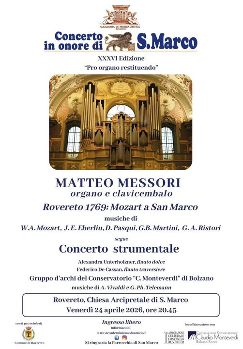 Sarà un'occasione molto speciale: una serata per riportare l'attenzione sul monumentale organo a QUATTRO TASTIERE,55 REGISTRI, oltre 3500 canne che come noto da decenni versa in situazioni critiche.Breve presentazione del bolognese Matteo Messori, docente al Conservatorio "B. Marcello" di Venezia, affermato organista, clavicembalista, direttore e compositore: la rivista specializzata tedesca FonoForum ha scritto di lui: "La registrazione integrale delle opere tarde di Bach è un'affermazione con cui l'ancor giovane clavicembalista e organista italiano è giunto a giocare nella Champions League degli interpreti internazionali bachiani".Messori, conscio dei limiti imposti dalla situazione, eseguirà un programma suddiviso tra organo e clavicembalo, offrendo e facendo risonare il clima musicale trovato dal giovane Mozart nel suo primo viaggio in Italia. Come noto, nel dicembre 1769 Mozart con il padre diede a Rovereto un memorabile concerto proprio nella chiesa di San Marco.Anche il maestro di cappella di San Marco Domenico Pasqui, incontrato da Mozart, ha lasciato delle "Lezioni" che Messori realizzerà improvvisando all'organo e al clavicembalo, insieme ad alcuni partimenti predisposti per i propri allievi da Mozart stesso, ed eseguirà poi sonate di contemporanei con i quali Pasqui studiò a Salisburgo (J.E. Eberlin) e Mozart a Bologna (padre G.B. Martini).Il Concerto sarà completato da un programma per flauti e archi, in collaborazione con il CONSERVATORIO "C. MONTEVERDI" di BOLZANO: solisti diplomati e diplomandi (Alexandra Unterholzner flauto dolce e Federico De Cassan flauto traversiere) saranno accompagnati dal gruppo d'archi del Conservatorio, su musiche di A. Vivaldi e G. Ph. Telemann.