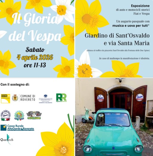 Il fascino senza tempo della Vespa incontra la tradizione del “Gloria” Anche quest'anno ci troviamo per tener viva la tradizione dello scambio di auguri per salutare la Pasqua e la primavera con uova, beverage, le note de “La musica del cuore” e tante auto e motocicli storici.Nel cuore del quartiere Santa Maria di Rovereto, il “Gloria” non è solo un brindisi: è un momento di comunità, storia e identità. Tra le vie del distretto, si respira un’atmosfera unica fatta di incontri, sorrisi e tradizioni che si tramandano nel tempo.Grazie al lavoro del Distretto Santa Maria e realtà come Vespa Club Rovereto, questa tradizione continua a vivere e a rinnovarsi, coinvolgendo cittadini, famiglie e visitatori.