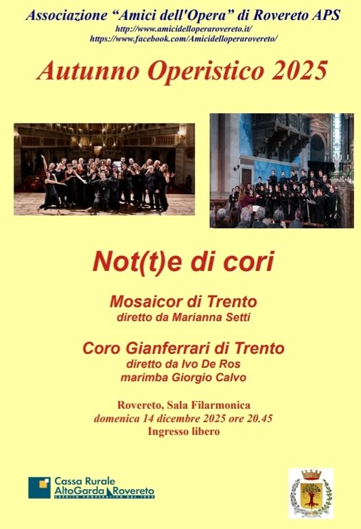 L’Associazione “Amici dell’Opera di Rovereto APS” è lieta di invitarVi al terzo concerto della stagione "Autunno Operistico 2025". La serata si intitola "Not(t)e di cori" e vede protagonisti due tra i più affermati cori presenti nel territorio trentino: il Mosaicor di Trento, diretto da Marianna Setti, e il Coro Gianferrari, diretto da Ivo De Ros, con la partecipazione straordinaria di Giorgio Calvo alla marimba.