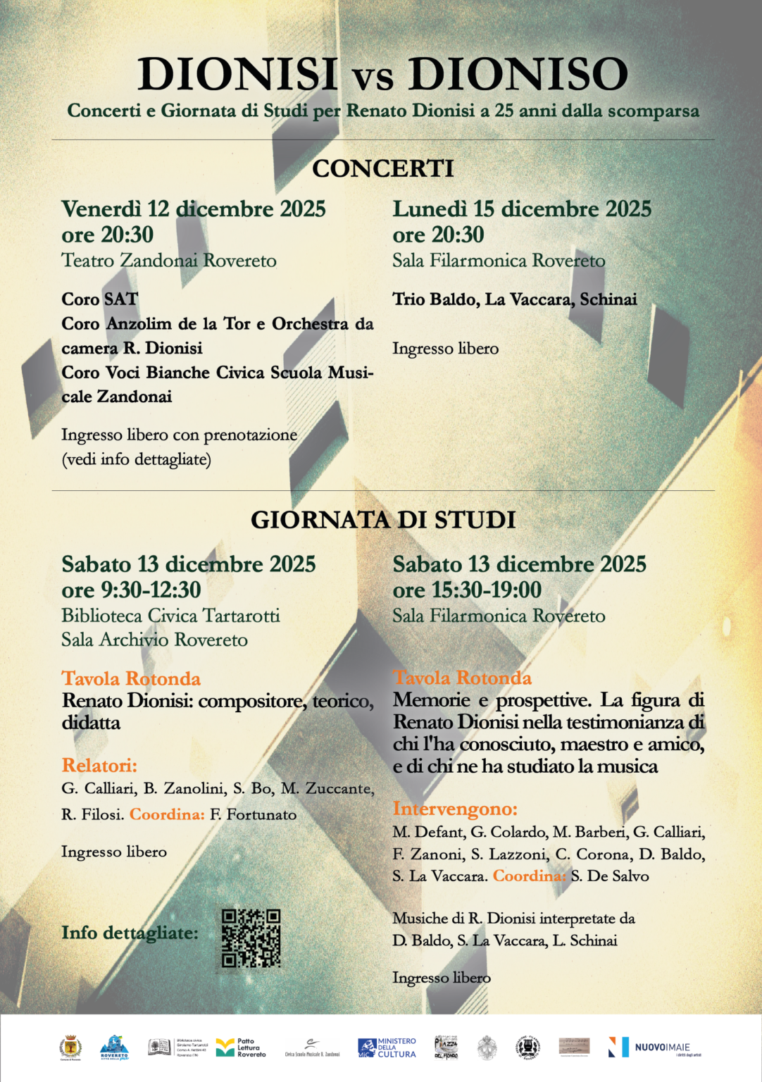 L’Associazione Culturale Piazza del Mondo, con il contributo del Comune di Rovereto e in collaborazione con realtà culturali significative del territorio – Biblioteca Civica G. Tartarotti di Rovereto, Civica Scuola Musicale R. Zandonai di Rovereto Associazione Filarmonica di Rovereto, Accademia Roveretana degli Agiati, Associazione Cameristica R. Dionisi -, promuove un progetto di valorizzazione e riscoperta della figura e dell’opera di Renato Dionisi, a 25 anni dalla sua scomparsa.