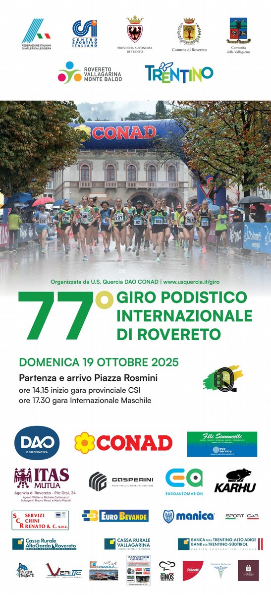 Corsa Internazionale su strada maschile di 10km con anteprima le gare del Centro Sportivo Italiano di corsa su strada. Ritrovo in Piazza Rosmini a Rovereto (apre il link in una nuova finestra) dalle ore 13:30 e inizio gare del CSI alle ore 14:15.
