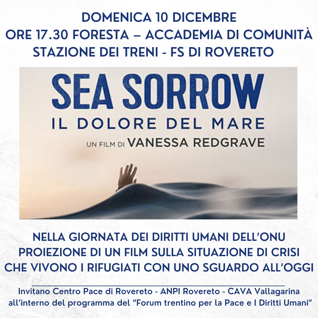 Nella Giornata Internazionale dei Diritti Umani, in occasione del 75° anniversario della Dichiarazione Universale dei Diritti Umani (10 dicembre 1948-2023) le associazioni per la Pace organizzano la proiezione del film “Sea Sorrow - Il dolore del mare”, appuntamento inserito all’interno del programma promosso dal Forum trentino per la Pace e i Diritti Umani.