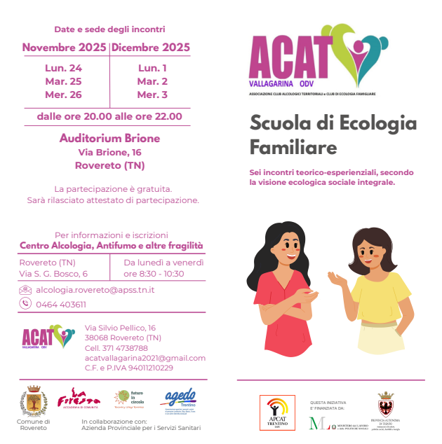 L'Acat Vallagarina in collaborazione con il Centro di Alcologia, antifumo e altre fragilità organizzano un ciclo di 6 incontri informativi della Scuola di Ecologia della Salute.