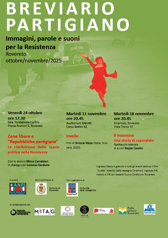 Tre gli appuntamenti proposti dalla sezione ANPI Rovereto-Vallagarina, con il contributo del Comune di Rovereto e della Comunità della Vallagarina, in collaborazione con il M/ITA/G (Museo storico della guerra), il Patto Lettura del Comune di Rovereto, Il Nuovo Cineforum Rovereto, il Centro Pace ecologia diritti - Rovereto, SmartLab Centro Giovani.