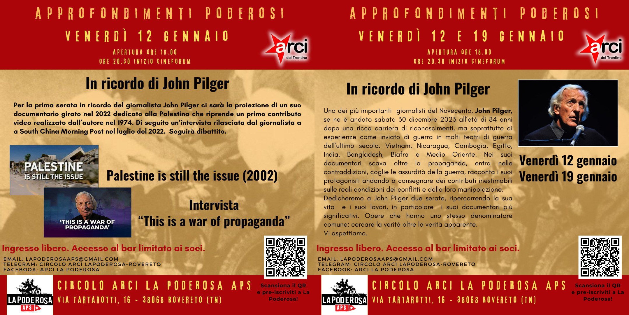 Venerdì 12 gennaio primo appuntamento dedicato al giornalista John Pilger. Un documentario dedicato alla Palestina realizzato nel 2002 e una delle sue ultime interviste in cui affronta il tema della propaganda di guerra in cui siamo immersi. Seguirà dibattito.