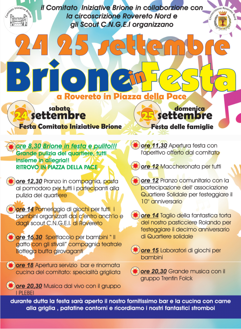 Il Comitato Iniziative Brione in collaborazione con la circoscrizione Rovereto Nord e gli Scout G.C.N.E.I. organizzano la manifestazione "Brione in Festa"