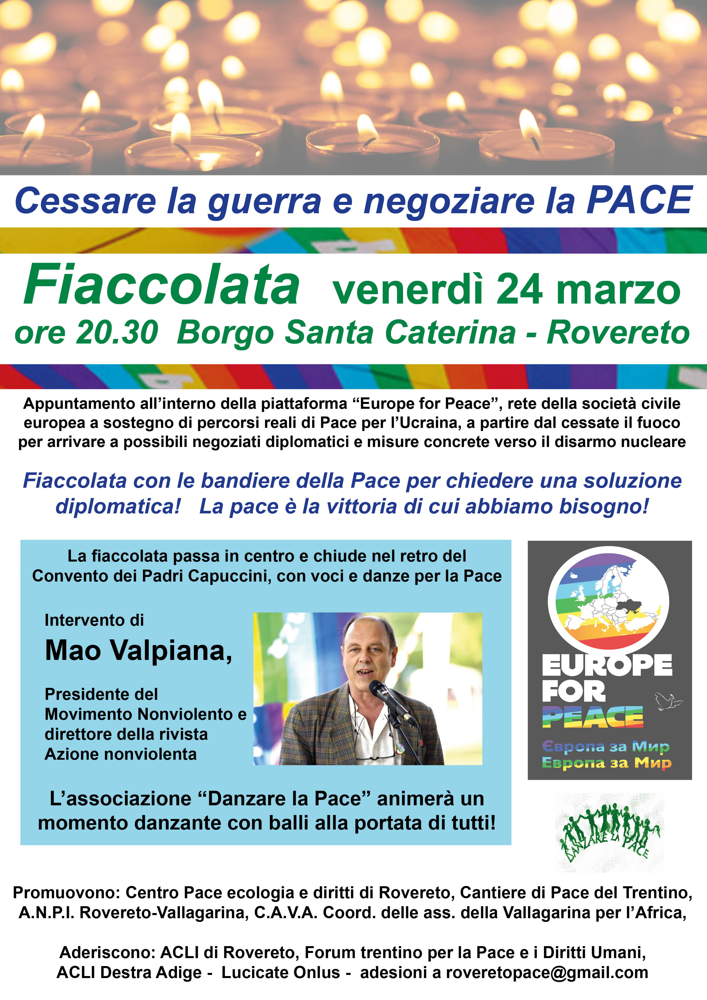 Fiaccolata per la Pace promossa dalle associazioni vicine a “Europe for Peace”, rete della società civile italiana ed europea a sostegno di percorsi reali di Pace per l’Ucraina, a partire dal cessate il fuoco per arrivare ad un dialogo con negoziati di pace e misure concrete verso il disarmo nucleare.