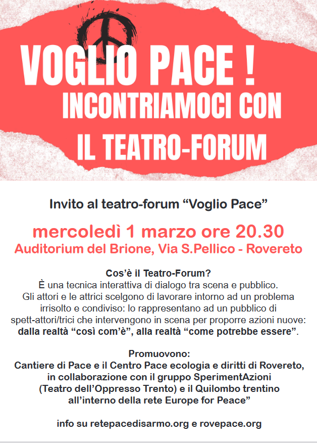 Cantiere di Pace e il Centro Pace di Rovereto invitano alla serata di Teatro-Forum con il gruppo SperimentAzioni (Teatro dell’Oppresso Trento).