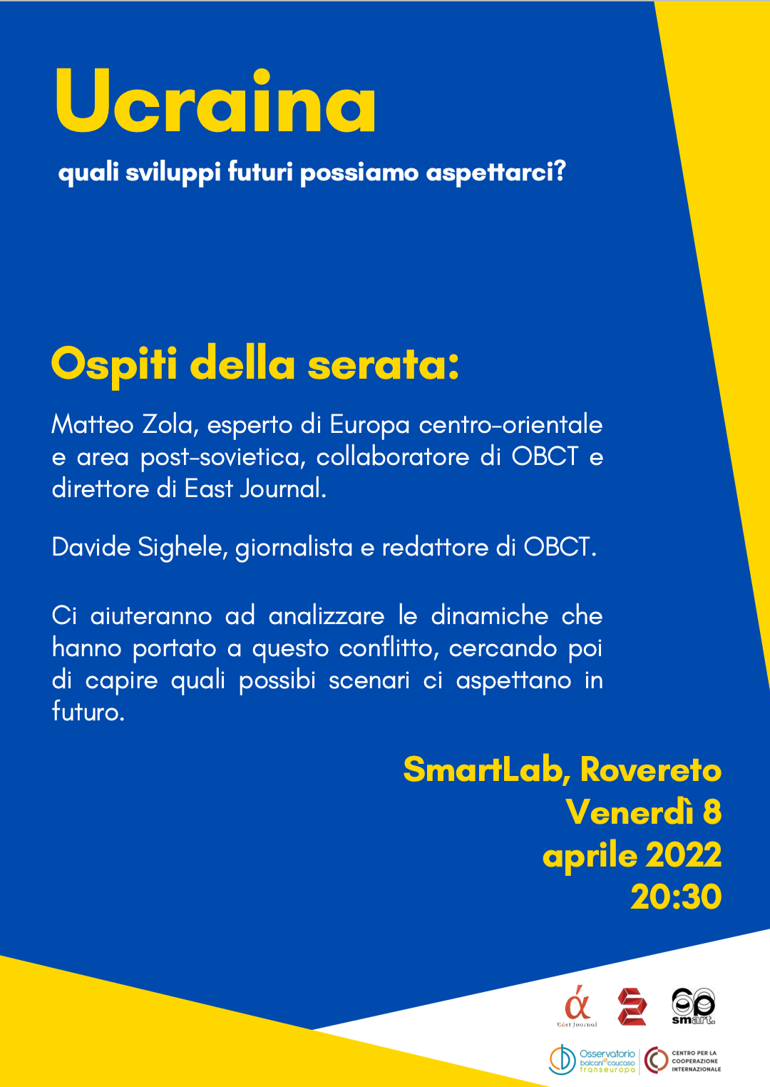 Nel corso dell'incontro cercheremo di analizzare le dinamiche scatenanti dell'invasione russa e proveremo a capire quali possibili scenari ci aspettano in futuro.Ospiti della serata saranno Davide Sighele, giornalista e redattore di Osservatorio Balcani Caucaso Transeuropa, e Matteo Zola, esperto di Europa centro-orientale e area post-sovietica, collaboratore di OBCT e direttore della rivista East Journal.