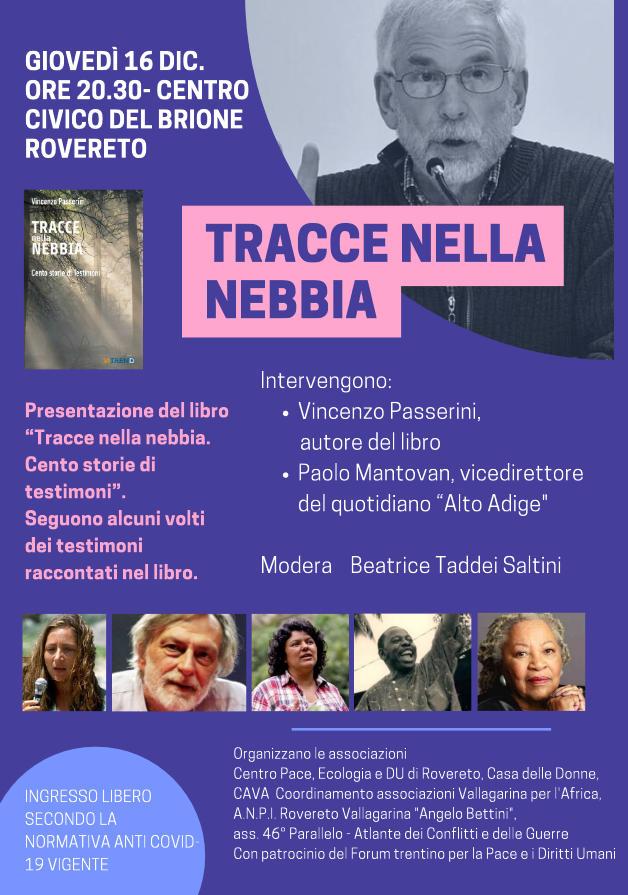 Organizzano le associazioni: Centro Pace, Ecologia e Diritti umani di Rovereto, Casa delle Donne, CAVA Coordinamento associazioni Vallagarina per l’Africa, A.N.P.I. Rovereto Vallagarina “Angelo Bettini”, ass. 46° Parallelo – Atlante dei Conflitti e delle Guerre. Con il patrocinio del Forum trentino per la Pace e i Diritti Umani.