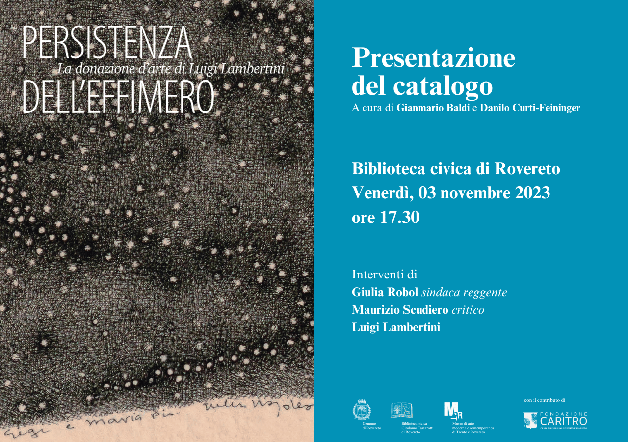 A cornice delle iniziative promosse dalla Biblioteca Tartarotti di Rovereto, legate alla Donazione d’arte di Luigi Lambertini viene presentato al pubblico il catalogo ragionato delle opere d’arte contemporanea donate al Comune. All’evento, che si terrà all’interno della esposizione delle 148 opere presso il Palazzo Alberti Poja, interverranno la sindaca di Rovereto Giulia Robol, il critico d’arte Maurizio Scudiero, il protagonista Luigi Lambertini e i curatori del volume “Persistenza dell’effimero / La donazione d’arte di Luigi Lambertini” Gianmario Baldi e Danilo Curti-Feininger.