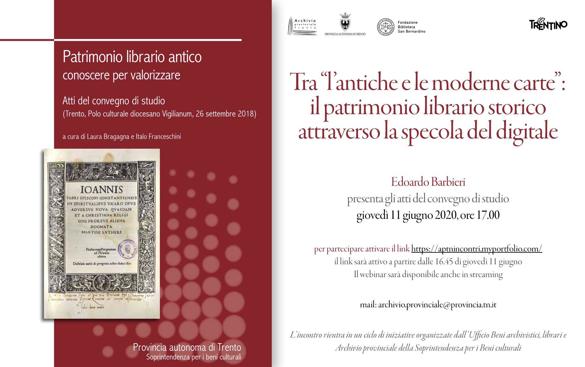 Si presentano in questa occasione gli atti del convegno “Patrimonio librario antico: conoscere per valorizzare”, organizzato dall’Ufficio Beni archivistici, librari e Archivio provinciale della Soprintendenza per i Beni culturali, in collaborazione con la Fondazione Biblioteca San Bernardino di Trento, che si è tenuto presso il Vigilianum, Polo culturale diocesano di Trento, il 26 settembre 2018.