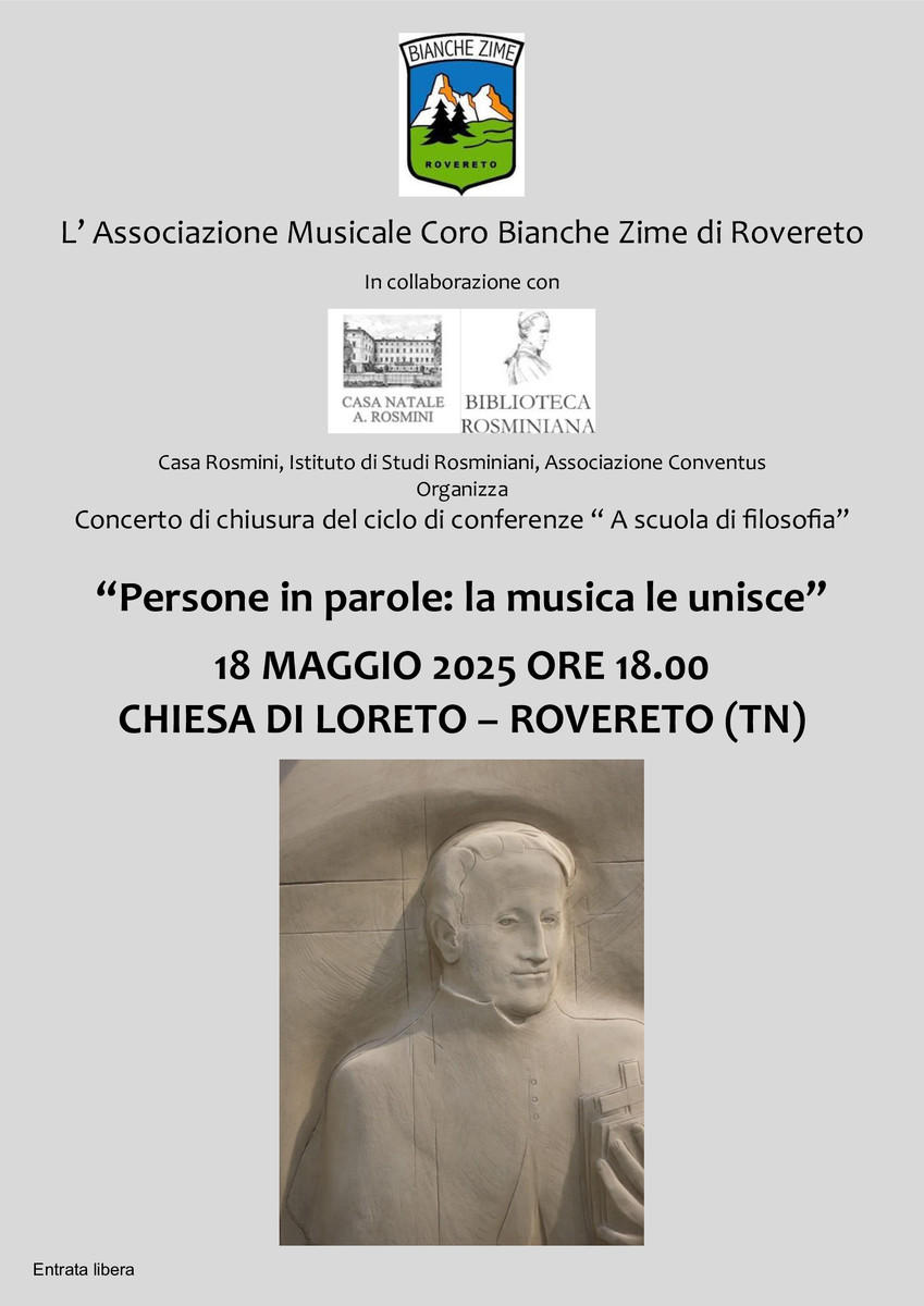 L'Associazione Musicale Coro Bianche Zime in collaborazione con Casa Natale Antonio Rosmini, Istituto di Studi Rosminiani e l'Associazione Conventus, organizza un concerto di chiusura del ciclo di conferenze " A scuola di filosofia".