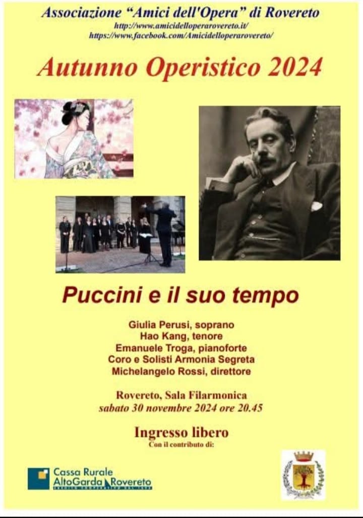 L'Associazione Amici dell'Opera di Rovereto, per celebrare il centenario pucciniano, ha invitato il Coro "Armonia Segreta" di Mantova per un programma suggestivo ed emozionante, che comprenderà pagine dalle opere più famose di Puccini ("La Bohème", "Tosca", "Madama Butterfly", "Gianni Schicchi", "Turandot"), ma anche di alcuni suoi celebri contemporanei, Mascagni ("Cavalleria rusticana", "L'amico Fritz") e Leoncavallo ("Pagliacci").