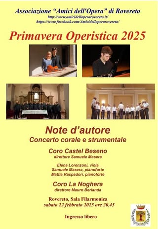 L'associazione Amici dell'Opera di Rovereto inaugura la sua nuova stagione di concerti, Primavera Operistica 2025, con un concerto corale e strumentale che intende valorizzare il mondo della coralità trentina e i giovani talenti, come da tradizione consolidata dell'associazione.Si esibiranno il Coro Castel Beseno, diretto da Samuele Masera; il pianista solista Mattia Raspadori; il duo formato da Elena Lorenzoni, viola, e Samuele Masera, pianoforte; il Coro La Noghera diretto da Mauro Berlanda.Un'occasione da non perdere per gustare una serata all'insegna della musica di qualità, spaziando dal repertorio classico al popolare canto della montagna.