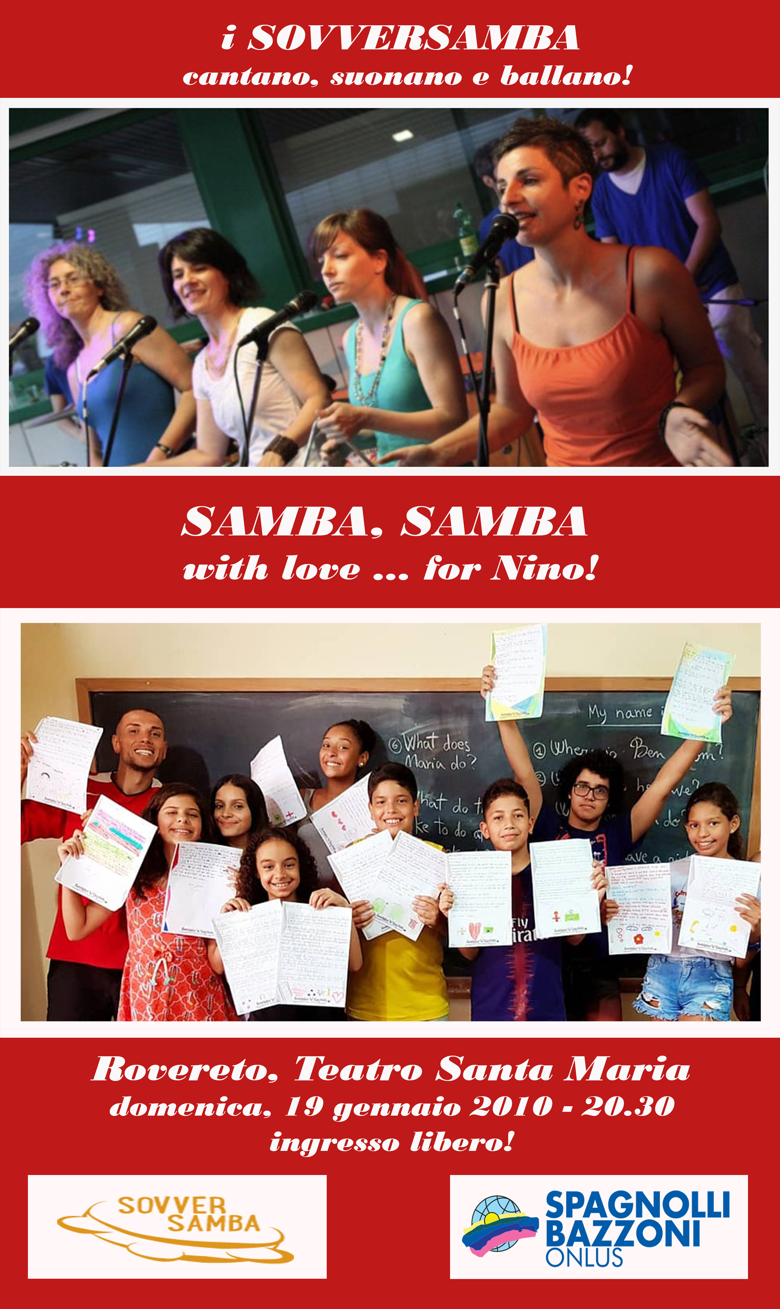 Cogliendo l’occasione della presenza in Italia di Nino, questo evento musicale, desidera, grazie alla coinvolgente ritmica brasileira eseguita dai SOVVERSAMBA far conoscere la magnifica attività socio-educativa svolta dalla Escola CRIATIVA nella favela della ROCINHA a Rio de Janeiro.