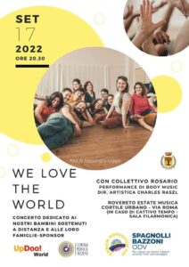 WE LOVE THE WORLD con il Collettivo Rosario-Body Music, Canto, Danza e Teatro musica, danza, poesia e testimonianze dedicate ai nostri bambini sostenuti a distanza e alle nostre famiglie-sponsor che li sostengono con amore e generosità!“I nostri bambini sono soli. Vivono in strada. I loro genitori spesso sono morti di AIDS. I nostri bambini sono orfani per la vergogna della comunità che li abbandona. Indossano vestiti sformati, si cibano soltanto di riso e cavoli. I nostri bambini non hanno una casa, una scuola; vivono in baracche di lamiera e cartone.