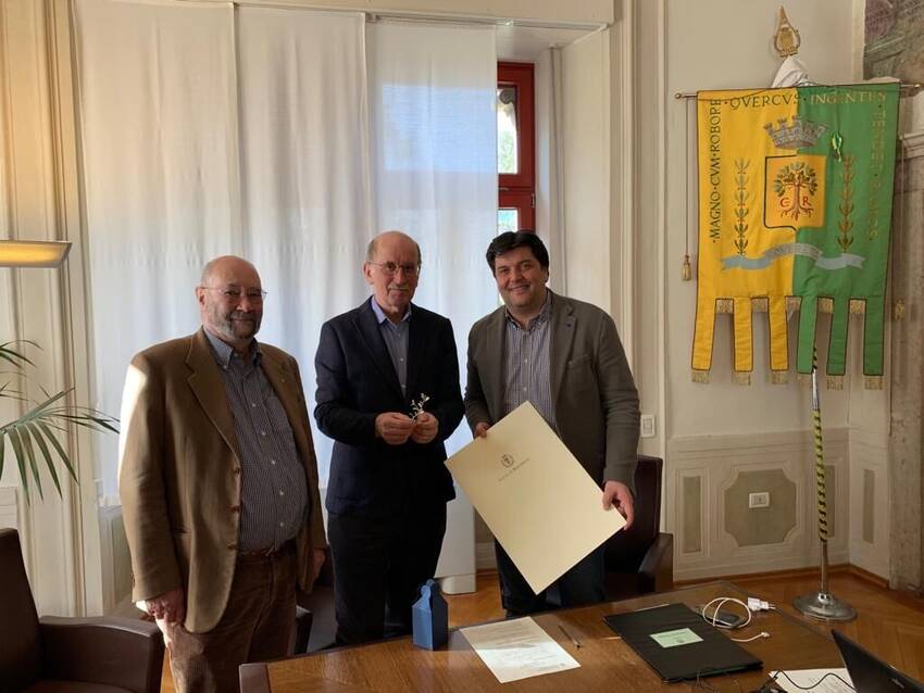 La visita si è conclusa con la consegna di un omaggio simbolico: un ramo di quercia d’argento e una cartella di litografie realizzate dall’artista Annalia Spagnolli dedicate al Palazzo del Podestà sede del Municipio.