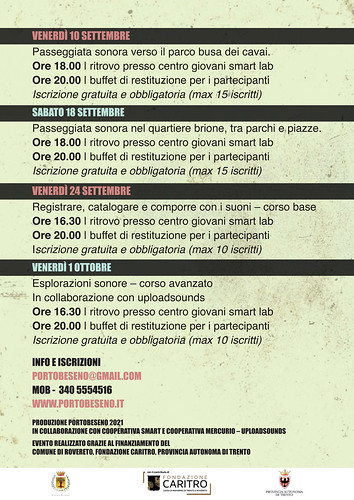 Laboratorio di field recording e archivi sonori digitali (corso base): utilizzeremo registratori audio per raccogliere e catalogare i suoni ambientali e per comporre, infine, una personale narrazione audio, un racconto sonoro di territorio.