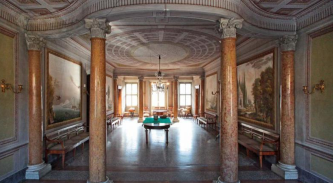 Estremamente interessante è anche il salone del piano nobile del palazzo che costituisce un unicum nell’architettura della Vallagarina tra il XVIII ed il XIX secolo. Questo spazio di rappresentanza è caratterizzato da una cupola ellittica a lacunari dipinta sul soffitto con effetto illusionistico e da due diaframmi, realizzati mediante vere colonne di marmo rosa, che suddividono lo spazio interno in tre ambiti distinti. Alle pareti si può ammirare un ciclo pittorico che raffigura scene tratte dall’Orlando Furioso. Tali dipinti furono realizzati sul finire del Settecento da Giovanni di Dio Galvagni, artista originario di Isera.