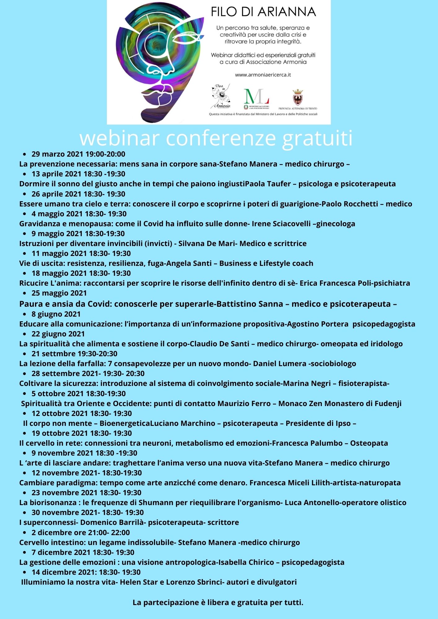 I webinar sono gratuiti, vanno prenotati sul sito www.armoniaericerca.it/filo-di-arianna/