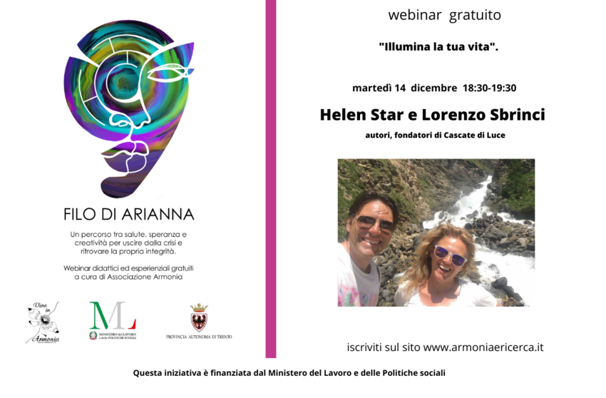 Conclude mercoledì 14 dicembre Filo di Arianna, il fitto calendario di appuntamenti di approfondimento organizzato da Associazione Armonia di Rovereto. Un viaggio che dalla primavera del 2021 ha accompagnato il pubblico attraverso temi di approfondimento legati al benessere psico fisico e momenti di laboratorio con cui sviluppare equilibrio interiore e creatività. In tempi di incertezza e mancanza di socialità, sebbene in forma di webinar online, Filo di Arianna ha cercato di intessere quella trama di crescita interiore della consapevolezza ed equilibrio oltre che di creatività, così come ha trattato temi con cui incontrare non solo il se interiore, ma anche l’altro con serenità e accoglienza. Volgendo al termine, Filo di Arianna ha scelto di accomiatarsi al suo pubblico con gli autori Lorenzo Sbrinci ed Helen Star in un incontro dal titolo “Illuminiamo la nostra vita”. L’incontro, che inizia alle 18.30 il 14 dicembre, è online e come consuetudine potrà essere seguito ad accesso gratuito ma con prenotazione al sito www.armoniaericerca.it.