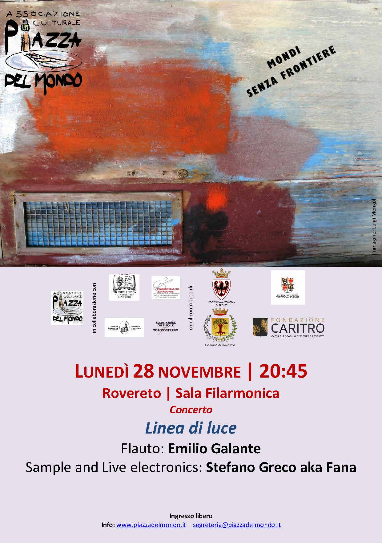 Oggi, in duo con Stefano Greco aka Fana, Linea di Luce trasforma il colore apollineo, intimista e melanconico di quel primo lavoro in un’estasi dionisiaca, monumentale e inaudita per un esile strumento monodico. Fana rilegge con vertiginosa live electronics i lavori scritti nell’ultimo trentennio da Galante per flauti acustici mentre Galante reinventa con l’improvvisazione i lavori elettronici di Fana. In mezzo un omaggio incantato a Marco Tutino con le sue “Cose preziose”.