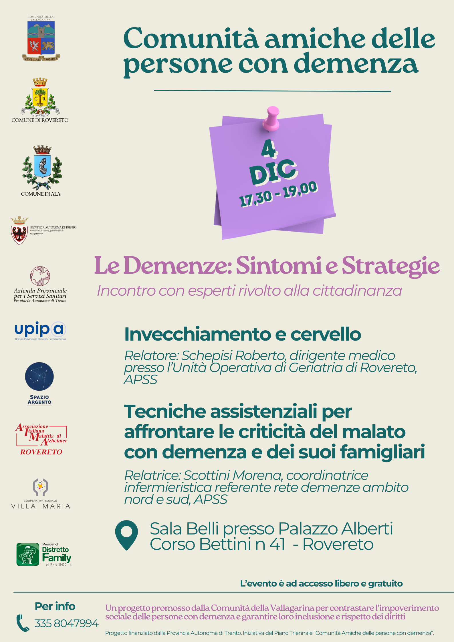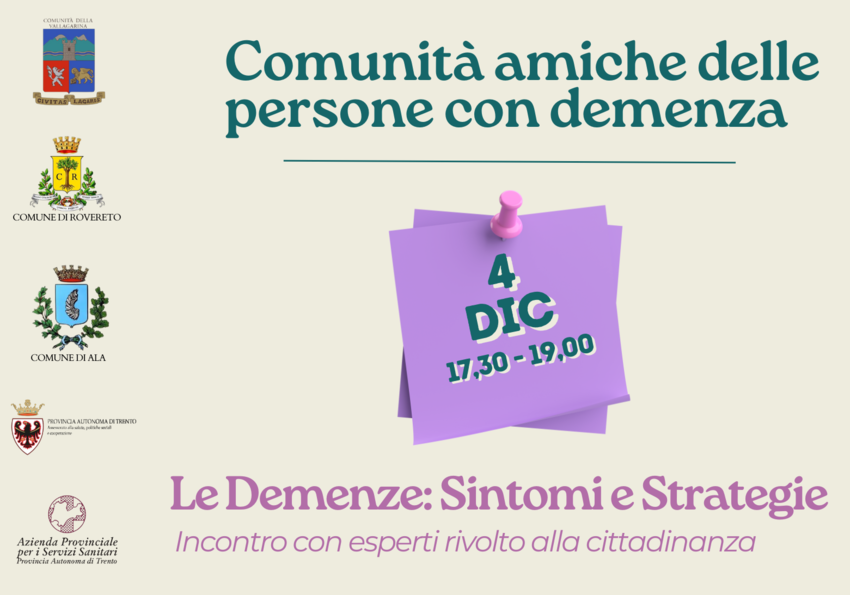 Nell'ambito del progetto Comunità Amiche delle Persone con Demenza il 4 dicembre 2024 ad ore 17.30, presso Palazzo Alberti, Sala Belli, si terrà un incontro con esperti dal titolo "Le demenze: sintomi e strategie".
