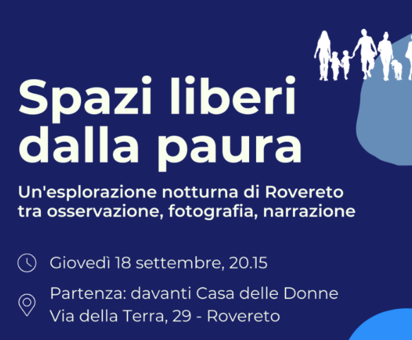 Mercoledì 18 settembre si svolgerà a Rovereto una camminata serale, primo di una serie di appuntamenti della rassegna “Spazi liberi dalla paura” organizzata dal Dipartimento di Psicologia e di Scienze cognitive dell’Università di Trento con il contributo del Comune di Rovereto. La camminata è pensata come un percorso partecipato di sensibilizzazione al tema della violenza sulle donne e un invito rivolto alla cittadinanza a vivere e a riappropriarsi in modo condiviso e consapevole di quegli spazi pubblici, come sottopassi, parchi e stazione dei treni che, soprattutto nelle ore notturne, sono considerati poco sicuri.