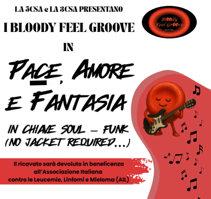 Le classi 3CSA e 5CSA Liceo Scienze Applicate A. Rosmini Rovereto con la docente referente prof.ssa Paola Cavazzana e con la prof.ssa Ilenia Mariazzi invitano la cittadinanza allo spettacolo musicale di beneficenza “Pace, Amore e Fantasia. In chiave soul-funk ( No Jacket Required)” in favore di A.I.L., Associazione Italiana contro le Leucemie